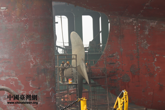 正在中遠川崎維護的南通號15萬噸級巨輪。圖為巨輪螺旋槳部分。 (中國臺灣網 王偉 攝)
