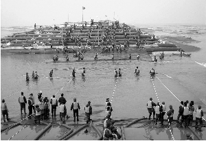 2006年12月1日,建設人工島戰役打響。這一洋口港的“前哨”工程是洋口港建設的關鍵。人工島項目共分為3個區,圍填面積約為1.44平方千米,島壁結構總長度為4688.458米,內隔堤總長度3477.09米,結構安全等級為一級,設計使用年限為50年。人工島工程結構由鋼板樁施打、軟體排鋪設、島壁拋石施工、充填管袋施工、內隔堤施工、吹填施工和胸墻施工等組成,離岸最近處達13千米,低潮時南側露灘,高潮時全部淹沒,施工時全部依靠船舶作業,受風浪潮汐的影響大,大汛期潮差達8.4米,每月的作業天數平均不到一半。加之本地石料資源短缺,石料必須經長江口從190海里外的浙江舟山運來。現場作業船、運輸船、交通船日常就有二三百艘,高峰期就有400多艘,裝載機、自卸汽車、吊車、挖掘機等機械設備100臺輛,加上千余名施工人員,給現場指揮帶來難以想象的困難。