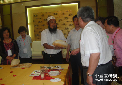 “枕頭饃”的傳人向臺灣客人介紹枕頭饃的歷史(圖片來源:阜陽市臺辦)