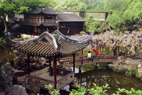 前曲溪宛轉(zhuǎn),流水淙淙。東麓有水閣“活潑潑地”。橫臥于溪澗之卜,令人有水流不盡之感。北部原有建筑早已廢毀,現(xiàn)廣植竹、李、桃、杏,“又一村”等處建有葡萄、紫藤架。其余之地辟為盆景園,花木繁盛,猶存田園之趣。留園以宜居宜游的山水布局,疏密有致的豐間劉比。獨(dú)具風(fēng)采的石峰景觀,成為江南園林藝術(shù)的杰出典范。