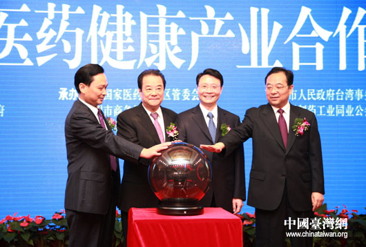 9月19日,“蘇臺生物醫藥健康產業合作高峰會”在江蘇泰州“中國醫藥城”舉行。在高峰會上,江蘇省副省長何權(右二)、臺灣工業總會理事長陳武雄(左二)中共泰州市委書記張雷(右一)和泰州市代市長徐郭平(左一)共同啟動海峽兩岸(泰州)生技產業園開園儀式。(中國臺灣網 鐘寶華 攝)