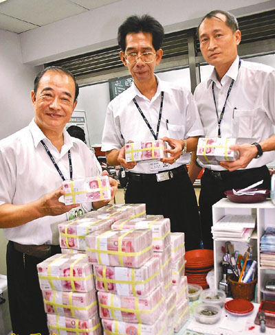 臺灣土地銀行金門分行展示人民幣現鈔(資料圖片)