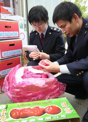 23日上午,今年首批臺(tái)灣水果運(yùn)抵廈門,經(jīng)廈門市檢驗(yàn)檢疫局檢驗(yàn)完后正式投入市場(chǎng)。據(jù)悉,此次抵達(dá)廈門的臺(tái)灣水果有9個(gè)品種,包括鮮菠蘿、鮮棗、柑等水果,共6220千克。 吳曉平 攝影報(bào)道 來源:臺(tái)海網(wǎng)