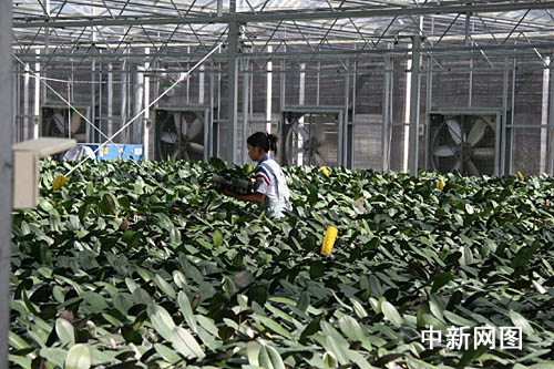 漳州富圣蘭花生物科技有限公司內(nèi)一名員工在園區(qū)內(nèi)修正蘭花