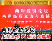 2006年,在兩岸同胞的共同努力下,兩岸經濟交流與合作取得了新的積極進展,走向一個范圍更廣、層次更高、關系更緊密的新局面。國共兩黨有關方面通力合作,分別于2006年4月和10月在大陸舉辦了兩岸經貿論壇和兩岸農業合作論壇系列活動,分別宣布了促進兩岸交流合作、惠及臺灣同胞的15項政策措施及擴大兩岸農業合作、惠及廣大臺灣農民的20項政策措施,在海內外產生了廣泛的積極影響,帶動兩岸經貿活動持續熱絡,并取得實實在在的成效……
