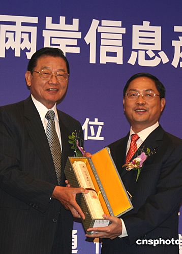 圖為華聚產(chǎn)業(yè)共同標(biāo)準(zhǔn)推動(dòng)基金會(huì)董事長(zhǎng)江丙坤(左),中國(guó)通信標(biāo)準(zhǔn)化協(xié)會(huì)名譽(yù)理事長(zhǎng)、信息產(chǎn)業(yè)部副部長(zhǎng)蔣耀平互贈(zèng)禮品。