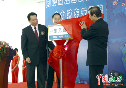 江西省委副書記、常務副省長吳新雄(左一),省委常委、南昌市委書記余欣榮(左二),東元集團董事長黃茂雄(右一)為“東元路”揭牌。(中國江西新聞網(wǎng)記者 王凱 攝)