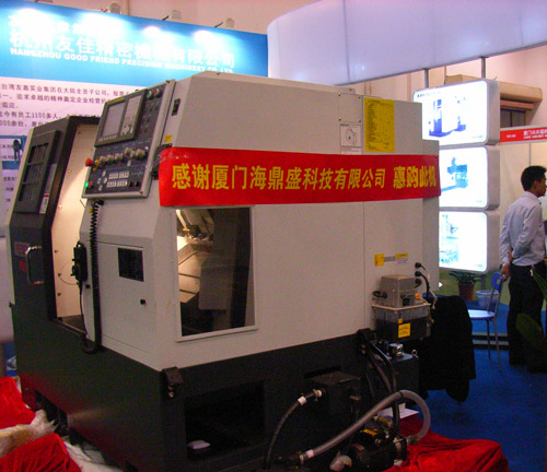 今天是第十二屆臺交會的最后一天,參展商在今天下午3:00開始撤展,許多展品早已被客商搶購。(圖為參展商杭州友佳精密機械公司帶來的展品已掛上被廈門海鼎盛科技有限公司惠購的紅布條)
