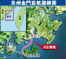 人民網(wǎng)6月7日電 據(jù)香港《文匯報》報道,繼大陸與臺灣“兩門兩馬”(金門-廈門,馬祖-馬尾)海上航線于2001年開通,拉開金廈“小三通”序幕之后,6月8日,備受兩岸關注的福建泉州石井與金門之間的客運直航也將開啟,成為閩南沿海距金門最近的海上“黃金水道”。經常往返于兩地的臺胞和兩岸的旅游業(yè)者,對這一新航線都充滿了期待。