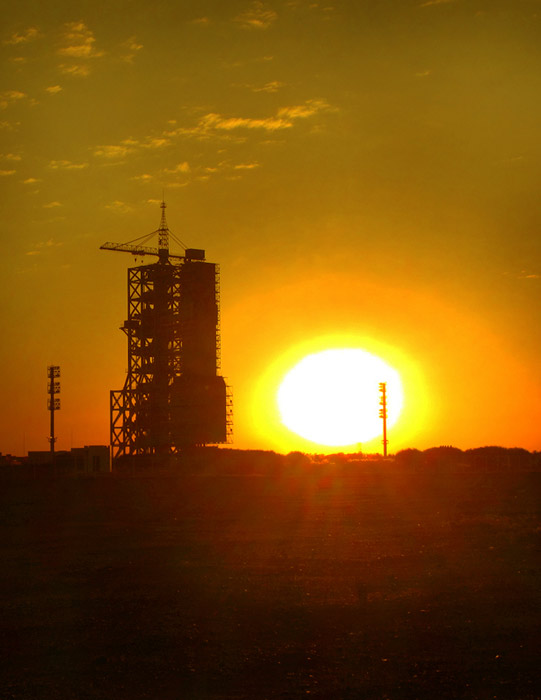2011年9月29日早晨,第一縷陽光照耀在中國酒泉衛星發射中心的發射塔架上,昭示著天宮一號發射升空的輝煌時刻即將到來。