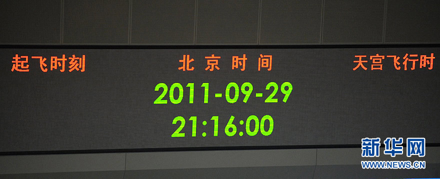 9月29日21時16分整,長征二號FT1火箭點火,天宮一號順利升空。這是北京飛控中心大屏幕時鐘顯示這一歷史時刻。新華網 陳競超 攝