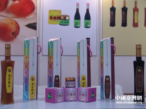 “鳳梨酵素、青梅精、納豆梅精”,臺灣特色農產品深加工品出現在了展臺上,準備向大陸消費者展示其濃郁的臺灣特色。(攝影:魏萌)