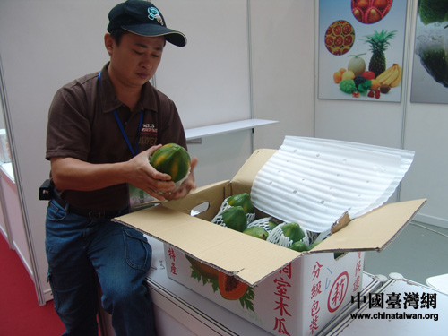 “木瓜露面了”,臺灣參展人員親自檢查負責用做展示的木瓜。(攝影:魏萌)