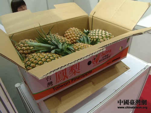 “鳳梨報到!”,零關稅“登陸”水果鳳梨出現在了展臺上。據了解,臺灣水果鳳梨與大陸水果菠蘿雖然外貌相近,但還是有區別的,鳳梨較之更為容易切片食用。(攝影:魏萌)
