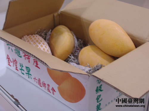 “不一樣的超級大芒果!”,10公斤的包裝箱里只能裝下4個芒果!記者用手掂了掂,每個芒果都差不多有2、3公斤重。據了解,每種參加展覽的農產品都經過了臺農精心篩選。(攝影:魏萌)