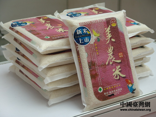 “有大米自寶島來,品嘗不亦樂乎?”,由高雄縣美濃鎮農會推廣的“美農米”,是被當地專業評為70分以上優質大米,此次參展農會共帶來130袋這樣的小包裝大米,每袋定價為100元人民幣/2kg。(攝影:魏萌)