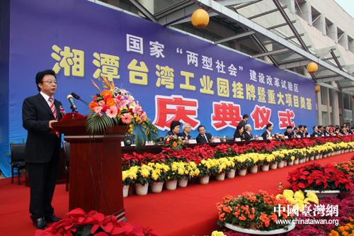 中國(guó)臺(tái)灣網(wǎng)11月16日湘潭消息 今天下午,作為國(guó)家“兩型社會(huì)”建設(shè)綜合配套改革試驗(yàn)區(qū)之一,湘潭臺(tái)灣工業(yè)園舉行掛牌和新項(xiàng)目入園奠基儀式,參加“第四屆湘臺(tái)經(jīng)貿(mào)交流合作會(huì)”的200余臺(tái)灣政商屆代表出席。