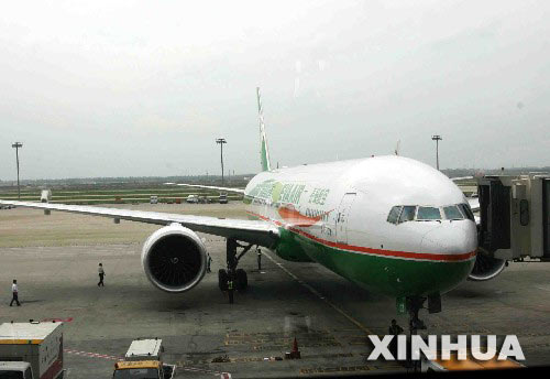 9月29日13時25分許,自臺北起飛的臺灣長榮航空公司BR1712航班,載著309位乘客抵達上海浦東國際機場。這是2006年兩岸中秋包機飛抵大陸的首個航班,標志著兩岸客運包機節日化的正式啟動。(新華社記者 張明 攝)