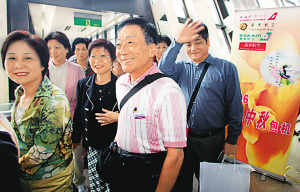 剛剛走下飛機的臺灣旅客。 潘索菲攝 本報北京9月29日訊 綜合本報和新華社消息:兩岸中秋包機今天啟動。上午11時,臺灣長榮航空公司的BR1712航班,由臺北起飛,13時25分順利抵達上海浦東國際機場。這是自今年6月兩岸業(yè)者就客運包機節(jié)日化達成共識后,首次執(zhí)行的首班包機,標志著兩岸客運包機節(jié)日化成功邁出第一步。