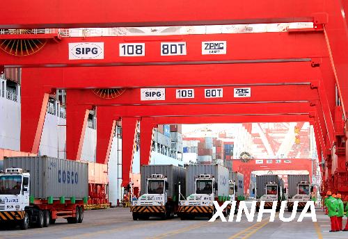 進(jìn)行集裝箱裝卸作業(yè)的上海洋山深水港區(qū)一景(2008年12月6日攝)。新華社記者陳飛攝