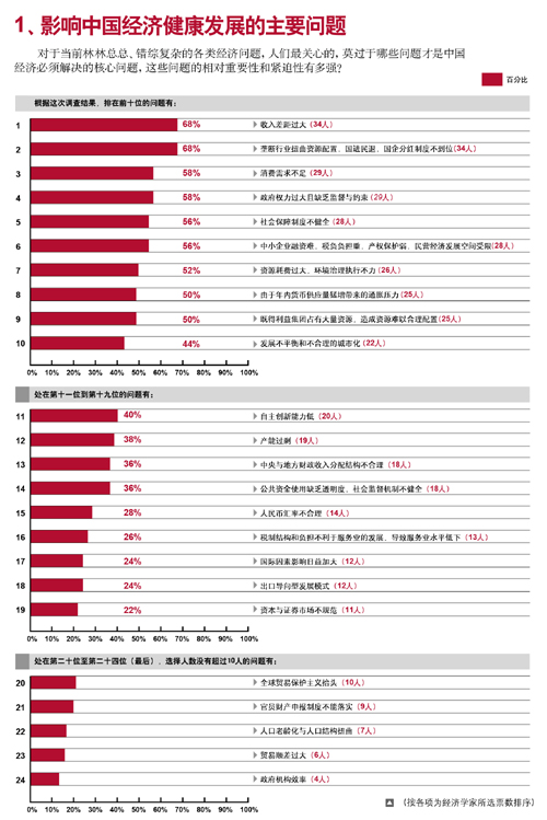 50位有造詣的中國經濟學家在我們梳理的林林總總、錯綜復雜的各類經濟問題中,選擇了各自心目中“影響中國經濟健康發展的主要問題”。