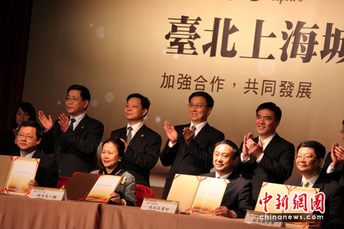 4月6日下午,在首度訪臺(tái)的上海市長(zhǎng)韓正(后排右2)、臺(tái)北市長(zhǎng)郝龍斌(后排右1)的見證下,兩市簽署文化、旅游、環(huán)保、科技園區(qū)交流合作4項(xiàng)備忘錄。中新社發(fā) 董會(huì)峰 攝