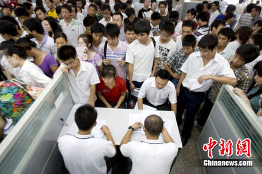 8月5日,河南鄭州,設在河南省人才交流中心051、052號展位的富士康招聘現(xiàn)場人頭攢動、水泄不通。當日,富士康在鄭州舉行招聘會。中新社發(fā) 王中舉 攝
