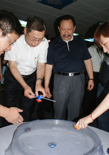 海基會副董事長高孔廉 (左2)試玩杭州中南卡通創作卡通陀螺周邊商品。圖片來源:“中央社”