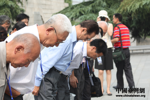 海內(nèi)外黃埔軍校同學(xué)會(huì)的校友、親屬、專家學(xué)者向遇難同胞三鞠躬。(中國(guó)臺(tái)灣網(wǎng) 肖燕 攝)