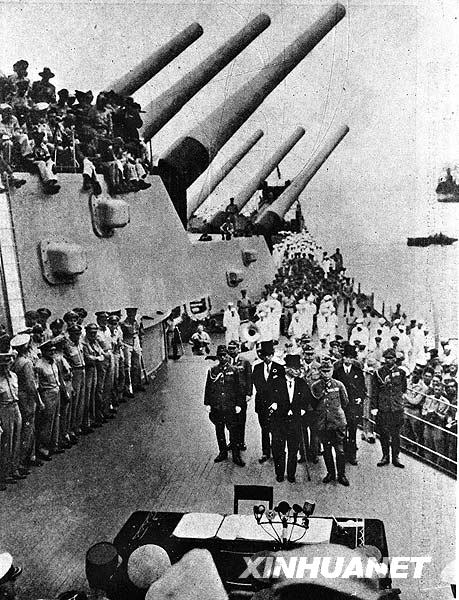 1945年9月2日,日本代表在東京灣美國“密蘇里”號戰列艦上簽署投降書。至此,三個法西斯軸心國中最后一個國家日本正式投降,第二次世界大戰以法西斯軸心國的失敗和反法西斯同盟國的勝利而告結束。這是簽字儀式的資料照片(1945年9月2日攝)。 新華社發