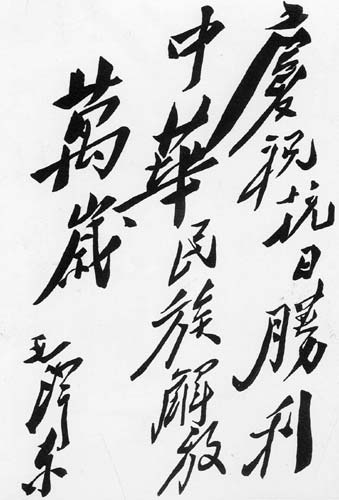 1945年9月,毛澤東為重慶《新華日?qǐng)?bào)》的題詞:“慶祝抗日勝利,中華民族解放萬(wàn)歲。”