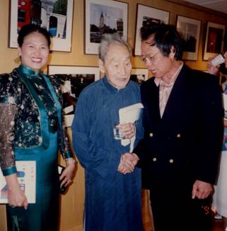 朗靜山大師(中間)與作者謝雨辰夫婦(合影于二哥影展現(xiàn)場(chǎng))