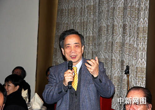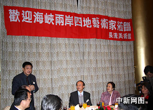 10日晚,臺灣長流美術(shù)館在臺北圓山飯店宴請前來參加活動(dòng)的兩岸及港澳三十多名畫家。(中)為臺灣長流美術(shù)館館長黃承志。(左一)致辭者為中國油畫家學(xué)會(huì)副會(huì)長張祖英。 中新社記者陳立宇 攝