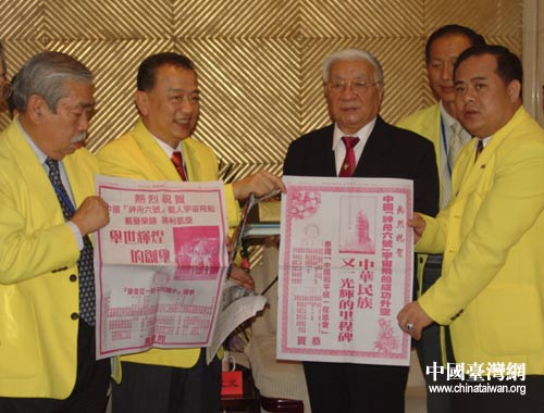 會見結束后,泰國統促會展示了贈送給中國統促會的禮物,一個是“神六”發射成功后泰國華人報紙大幅報道的原件,一個是由當地眾多華人華僑簽名的橫幅,上書:“慶祝中國人民抗日戰爭勝利暨反法西斯戰爭勝利100周年紀念:緬懷先烈勿忘國恥家仇,反對‘臺獨’、和平統一祖國。”(言恒)