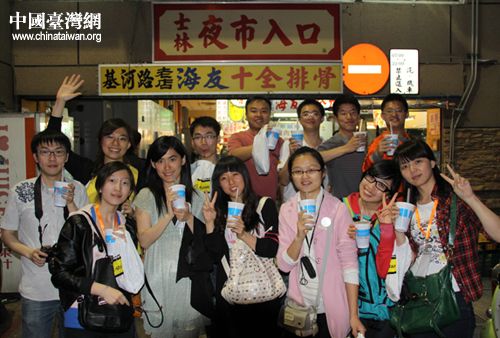 2011年4月10日,大陸高校參訪團的學生們前往臺北士林夜市品嘗特色小吃,在夜市入口處合影留念。(中國臺灣網 楊永青 攝)