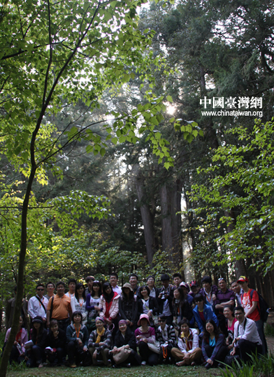 2011年4月14日,大陸高校參訪團游覽阿里山風景區,圖為在千年神木前合影留念。(中國臺灣網 楊永青 攝)
