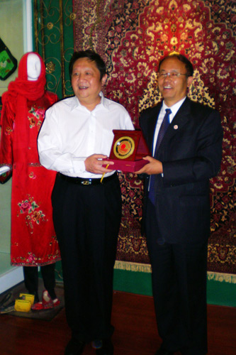 青海民族大學(xué)李生榮副校長(zhǎng)(右)向我會(huì)李寧秘書長(zhǎng)(左)贈(zèng)送紀(jì)念品