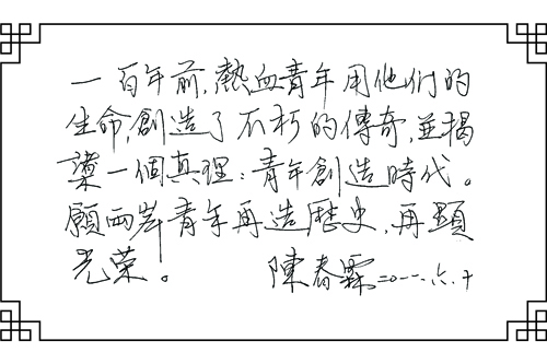 臺灣沈春池文教基金會秘書長陳春霖: 一百年前,熱血青年用他們的生命,創(chuàng)造了不朽的傳奇,并揭示一個(gè)真理:青年創(chuàng)造時(shí)代。愿兩岸青年再造歷史,再顯光榮。(圖文由中國宋慶齡基金會聯(lián)絡(luò)部提供)