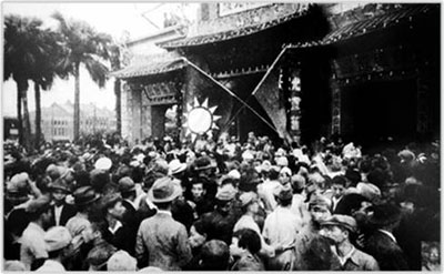 臺灣同胞在臺北中山堂受降會場外慶祝抗戰勝利。