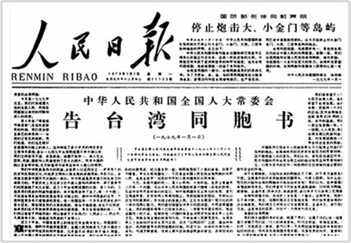 1979年元旦,全國(guó)人大常委會(huì)發(fā)表《告臺(tái)灣同胞書》,鄭重提出和平統(tǒng)一的方針,這是新時(shí)期中國(guó)共產(chǎn)黨和中國(guó)政府對(duì)臺(tái)方針政策的重要宣示,標(biāo)志著對(duì)臺(tái)方針政策的重要轉(zhuǎn)變。