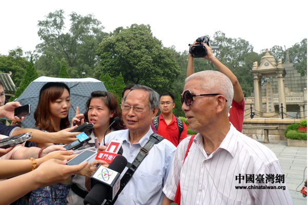 同盟會會員溫生才之孫溫國杰(左)向記者講述先輩起義經(jīng)過(中國臺灣網(wǎng) 李徽 攝)