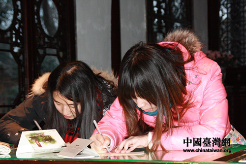 在拙政園內(nèi),同學們一樣不放過寄明信片的機會。大家紛紛來到明信片柜臺前購買明信片,并寫下內(nèi)心的感觸。有的同學由于不在臺灣,不能夠為自己的朋友慶祝生日而在明信片上面寫:“sorry,沒有辦法幫你慶祝生日,我在拙政園內(nèi)祝你生日快樂”。有的同學則在明信片上面寫道:“園林景色,千古流芳”,讓海峽對岸的朋友在看明信片的同時,也能領(lǐng)略到這如詩如畫的江南美景以及這獨具特色的古典園林。