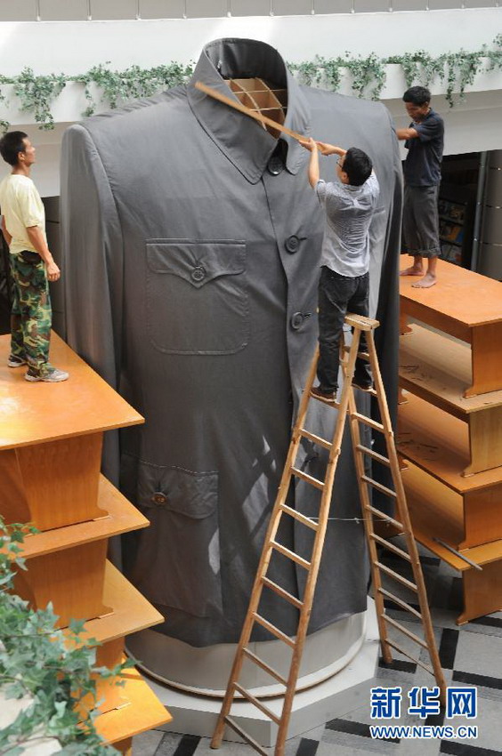 9月14日,工作人員在調整即將對外展出的巨型中山裝。