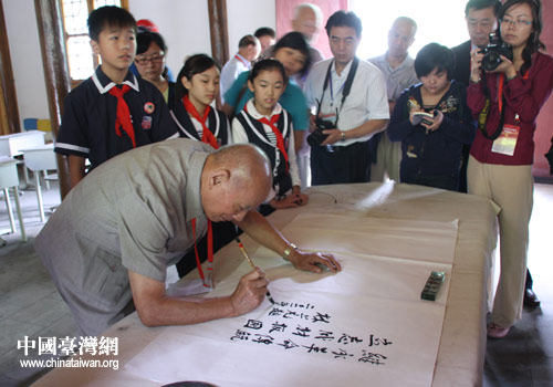 “繼承革命傳統(tǒng),立志成才報(bào)國(guó)——林上元題,二零一一年九月八日,年八十七歲”。黃埔同學(xué)會(huì)會(huì)長(zhǎng)林上元先生為武昌實(shí)驗(yàn)小學(xué)題詞,希望小朋友們學(xué)習(xí)老一輩革命家的精神,立志成才,報(bào)效祖國(guó)。(中國(guó)臺(tái)灣網(wǎng) 李丹 攝)