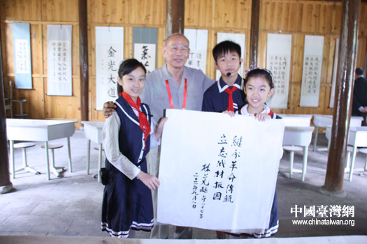 黃埔同學(xué)會(huì)會(huì)長(zhǎng)林上元先生與武昌實(shí)驗(yàn)小學(xué)的小講解員代表合影。(中國(guó)臺(tái)灣網(wǎng) 李丹 攝)