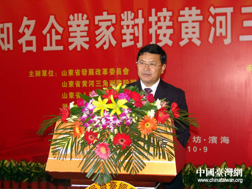 東營(yíng)市政府副市長(zhǎng)高一在海峽兩岸知名企業(yè)家對(duì)接黃河三角洲戰(zhàn)略合作推介會(huì)上致辭(圖片來(lái)源:東營(yíng)市臺(tái)辦)