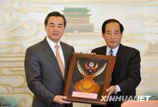 12月22日,王毅接受臺(tái)灣少數(shù)民族代表人士訪問團(tuán)贈(zèng)送的禮品。新華社記者 金良快 攝