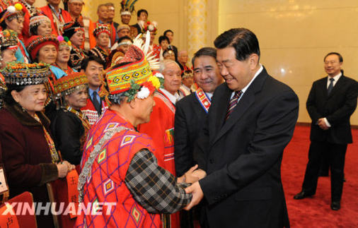 12月21日,中共中央政治局常委、全國政協主席賈慶林在北京人民大會堂會見臺灣少數民族代表人士訪問團一行。新華社記者黃敬文攝