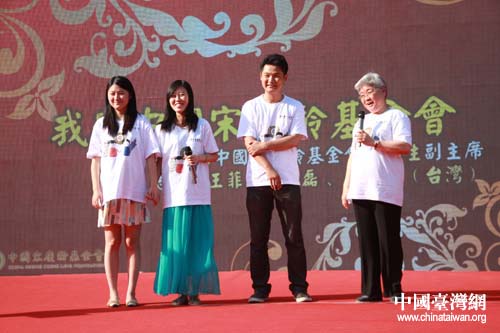中國宋慶齡基金會副主席唐聞生(右)與《我們的心》詞曲作者陳莉家、李正磊(中),志愿者王菲(左)在一起。(中國臺灣網 孟雅詩 攝)