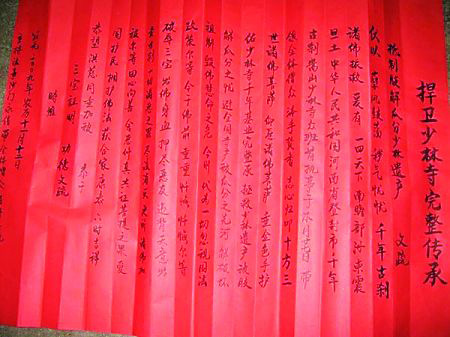 伏以 孽風鼓蕩 穢氣憂憂 千年古剎 諸佛振救 爰有 一四古剎 南瞻部洲東震旦土中華人民共和國河南省登封市千年古剎嵩山少林寺眾班首執事于本月二十七日 帶領全體僧眾 沐手焚香 志心歸叩 十方三世諸佛菩薩 仰愿諸佛菩薩垂金色手護佑少林寺千年基業完整(傳承) 拯救少林遺產被肢解瓜分之憂 避全國寺產被瓜分之先河 解破壞祖制 毀佛慧命之危 今則代為一切忽視國法政策爾等 今于佛前 重重懺悔 懺悔爾等 破辱三寶 出佛身血 押盡惡友 違背天意出賣古剎 一切諸惡之罪 盡該消滅更祈諸佛加被爾等 回心向善 舍惡修真公證菩提之果 愛國護民 擁護佛法 獲合家康泰 六時吉祥 恭望洪慈同垂加被